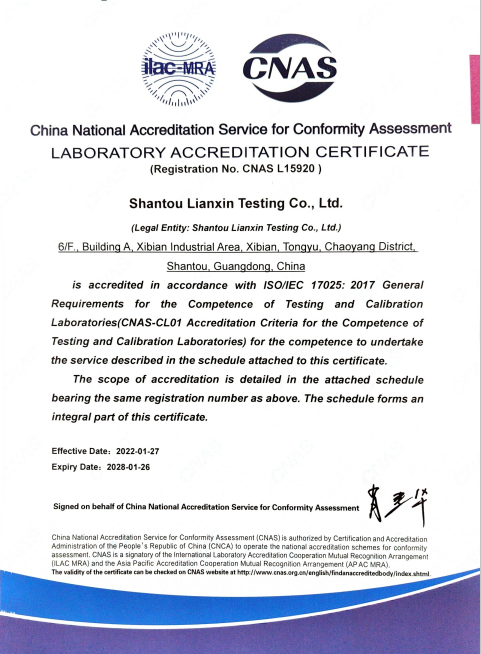 汕头市联信检测有限公司(简称联信检测LTT)自 2019 年创立以来,始终致力于为客户提供卓越、全面、专业的检测服务。联信检测以高度的责任感和使命感,为客户提供准确、可靠的检测结果,助力客户在市场上树立良好的品牌形象。